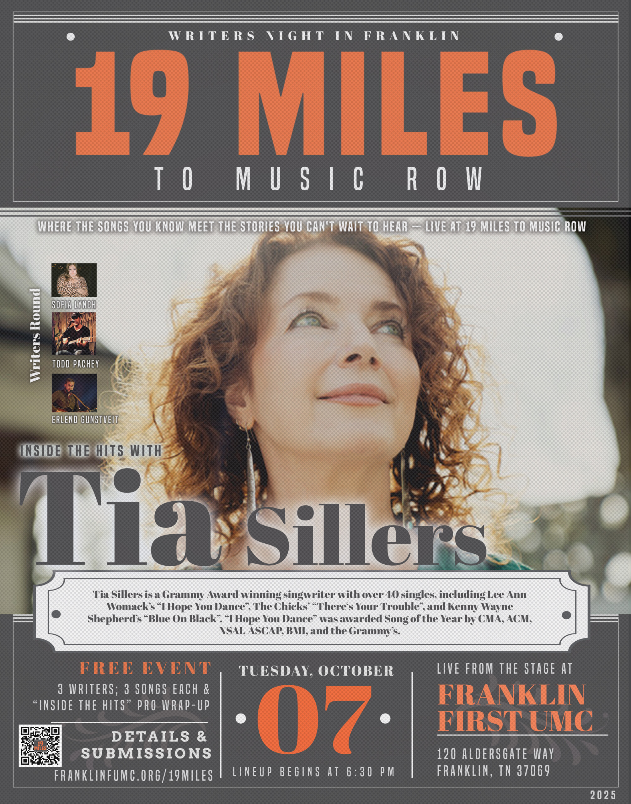 Tia Sillers is a Grammy Award winning songwriter who has had success with over 40 singles, including Lee Ann Womack’s “I Hope You Dance,” The Chicks’ “There’s Your Trouble,” and Kenny Wayne Shepherd’s “Blue on Black.”
